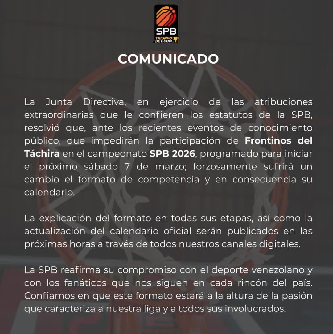 Mediante un comunicado oficial publicado en redes sociales, la liga anunció que Frontinos del Táchira finalmente no participará en la campaña 2026, pese a que el equipo se encontraba activo en la pretemporada con jugadores nacionales y extranjeros bajo la dirección del entrenador dominicano Carlos Morban.