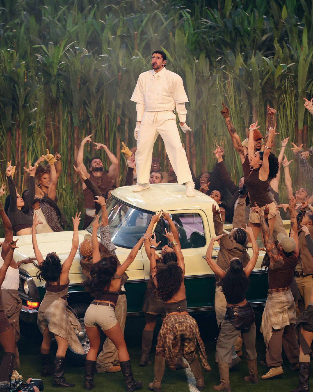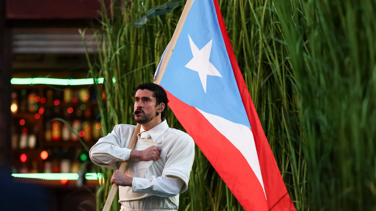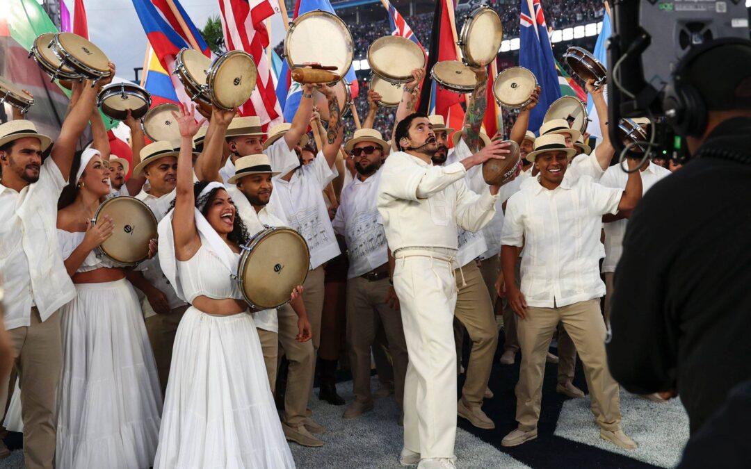 Caminando por el elaborado escenario, Bad Bunny arrancó con «Tití Me Preguntó» mientras avanzaba por un laberinto de hierba alta, pasando junto a hombres que jugaban al dominó y mujeres que se hacían la manicura, deteniéndose junto a carritos de tacos y piraguas, símbolos que para ningún latino pasaron desapercibidos.
