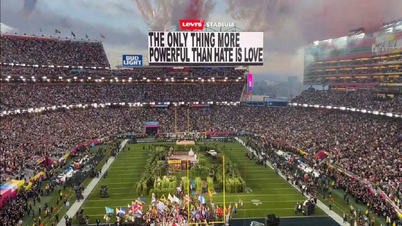 Durante el espectáculo, el artista incluyó mensajes a favor de la comunidad migrante, como la frase “La única cosa más poderosa que el odio es el amor”, escrita en inglés y exhibida en la parte trasera del estadio.