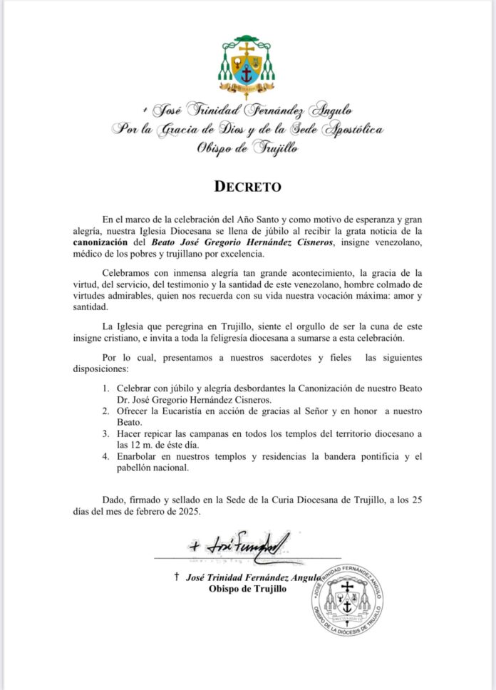 Tras el anuncio de la aprobación de los votos favorables del papa Francisco para la canonización de José Gregorio Hernández, el Obispo de Trujillo, José Trinidad Fernández, ordenó hacer sonar las campanas en todos los templos del territorio diocesano a las 12 del mediodía.
