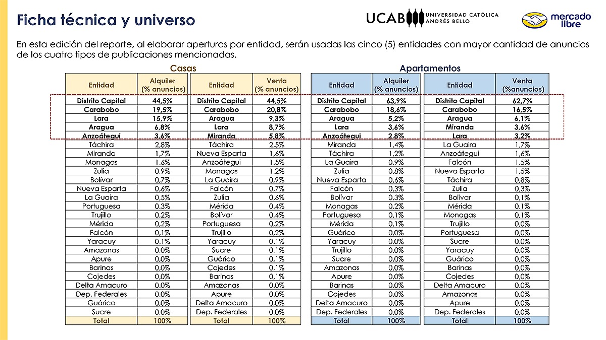 «Esta es una alianza con un partner estratégico como la UCAB, que nos está apoyando con el procesamiento de la data. Lo que buscamos es llenar vacíos de información de mercado con mucha data de Mercado Libre. No pretendemos establecer ningún tipo de marco de precios; estamos hablando de intención de venta», sostuvo Belisse Guerra, gerente comercial del mercado inmobiliario para Venezuela y Colombia en Mercado Libre, quien informó que los reportes se actualizarán cada seis meses.