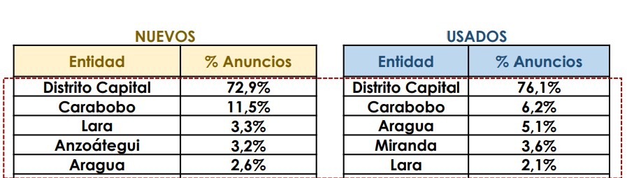 Entretanto, un reporte de las mismas organizaciones, también elaborado a partir de los avisos de venta de vehículos disponibles en el portal comercial, indica que más del 70 % de la oferta de carros y camionetas, nuevos y usados, se publicó en Caracas.