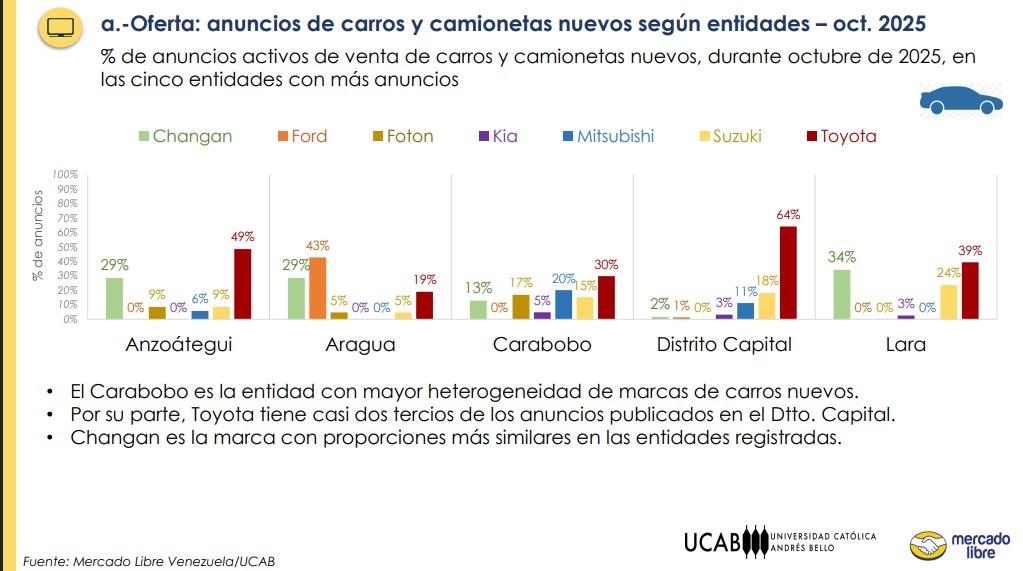 Los datos extraídos del informe «Mercado de Vehículos en Venezuela», basados en los 11.360 anuncios publicados en Mercado Libre durante octubre de este año, también ponen a Caracas como la plaza principal de venta de autos y camionetas.