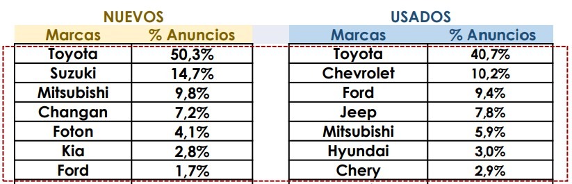 En cuanto a las marcas con más anuncios activos para ventas de autos nuevos, Toyota encabeza una clasificación de siete fabricantes, con 50 % en el segmento de carros nuevos y 40,7 % en el de usados.