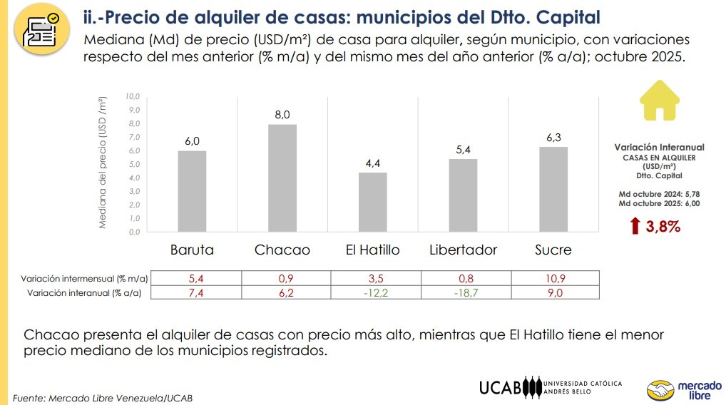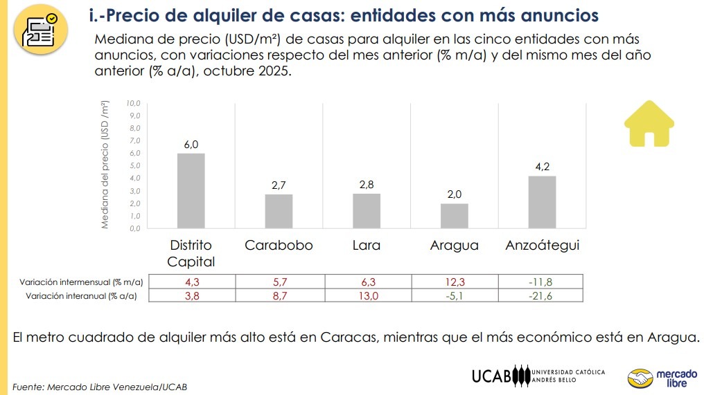 Los datos del reporte realizado por la UCAB y Mercado Libre también confirman que el costo más alto por metro cuadrado para alquiler de casas está en la ciudad capital, con un promedio de $6 y una variación intermensual con respecto al mes de septiembre de 4,3 %. El estudio precisa que el estado Aragua registra el precio más económico, con un promedio de $2 por metro cuadrado y una caída interanual de 5 %.