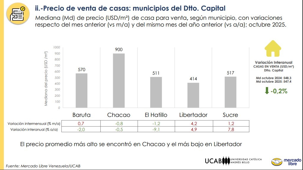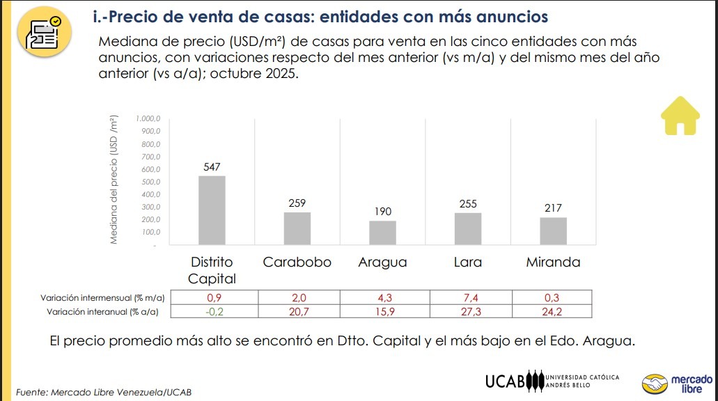Entre septiembre y octubre de este año, el valor de venta del metro cuadrado de las casas aumentó entre 0,3 % (Miranda) y 7,4 % (Lara). La variación interanual (octubre 2024-octubre 2025) del precio en dólares subió entre 15,9 % (Aragua) y 27,3 % en Lara. En el Distrito Capital, el costo se mantuvo prácticamente igual (cayó solo 0,2 %).