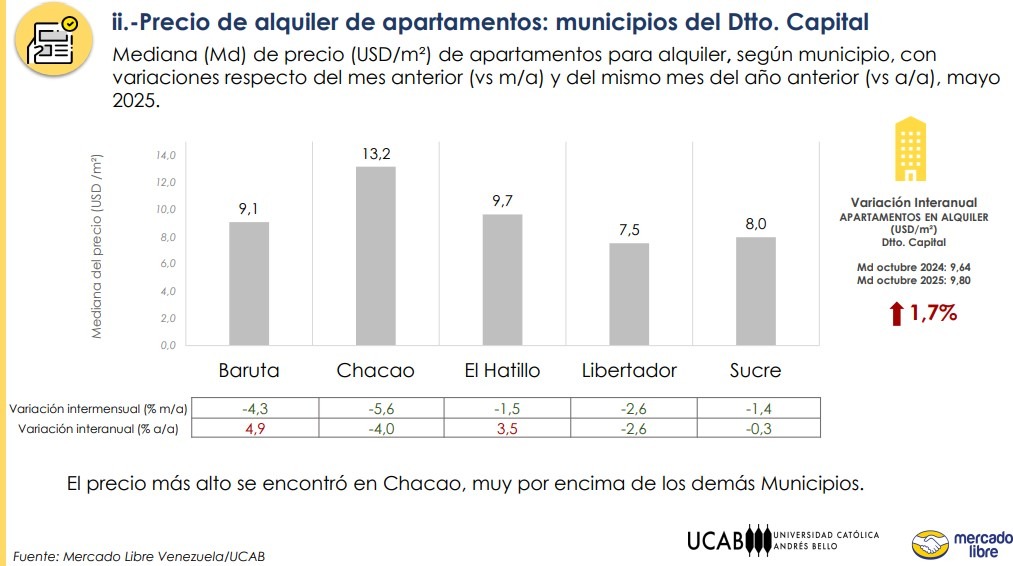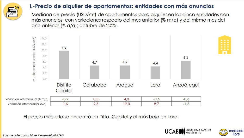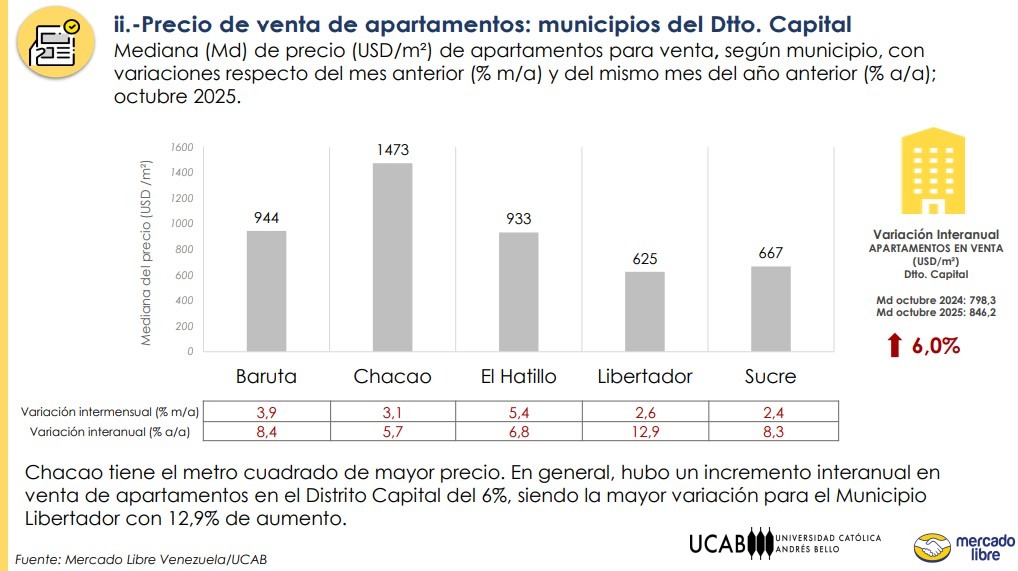 Según el estudio UCAB-Mercado Libre, la ciudad capital también registró el precio más alto en la venta de apartamentos durante el mes de octubre de 2025, con $846 por metro cuadrado, lo que representa un incremento interanual de 6 % respecto a los $798,3 en los que se cotizó, en promedio, en el mismo período de 2024.