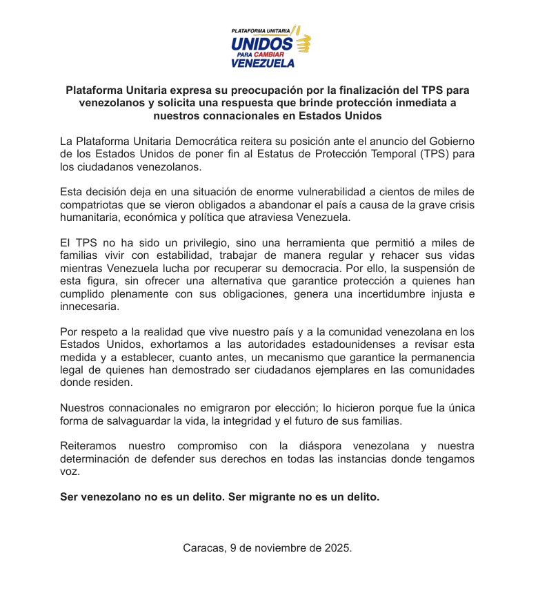La Plataforma Unitaria Democrática (PUD) manifestó su preocupación y desacuerdo ante la decisión del Gobierno de Estados Unidos de poner fin al Estatus de Protección Temporal (TPS) para los venezolanos, una medida que, según la coalición opositora, pone en riesgo a miles de compatriotas que residen en ese país.