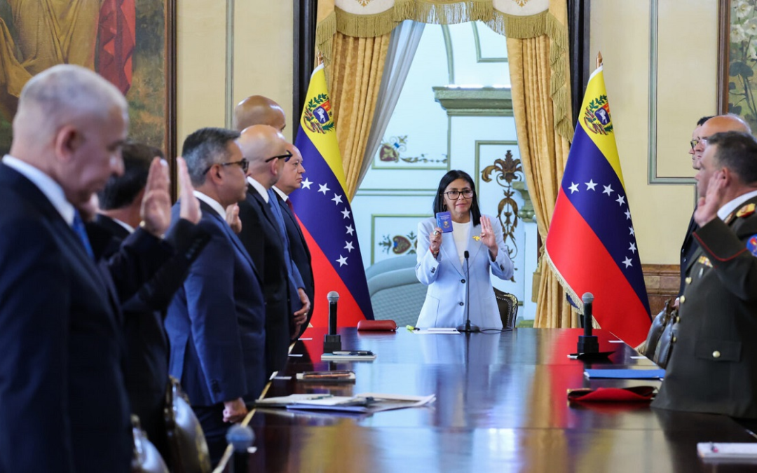 La presidenta encargada Delcy Rodríguez, lidera este jueves la ceremonia oficial de juramentación de los nuevos integrantes del Gabinete Ejecutivo desde el Palacio de Miraflores.