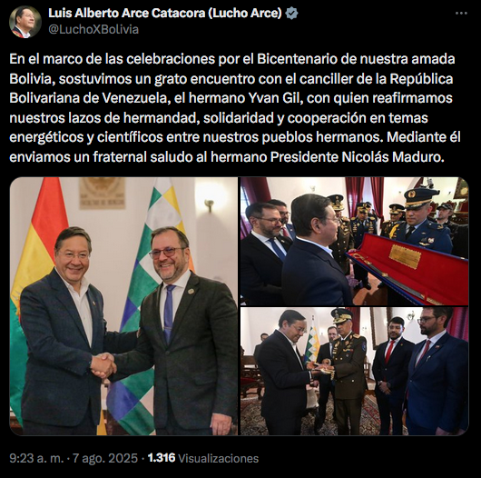 “En el marco de las celebraciones por el Bicentenario de Bolivia, sostuvimos un grato encuentro con el canciller de la República Bolivariana de Venezuela, hermano Yván Gil, con quien reafirmamos nuestros lazos de hermandad, solidaridad y cooperación en temas energéticos y científicos entre nuestros pueblos hermanos. Mediante él enviamos un fraternal saludo al hermano Presidente Nicolás Maduro”, escribió Arce este jueves en sus cuentas oficiales.